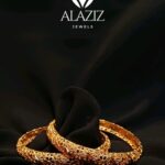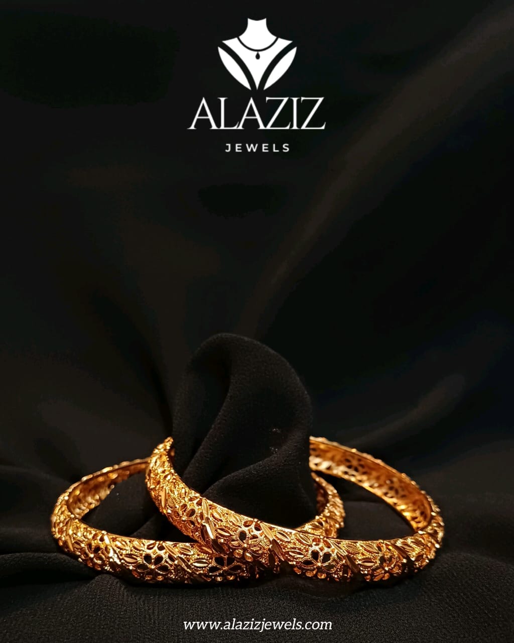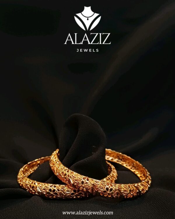 These intricately designed gold bangles feature a blend of geometric and floral motifs, showcasing exceptional craftsmanship and ornamental detail. The rich golden hue emphasizing their elegance and traditional charm. Ideal for ceremonial or festive wear, these bangles reflect the timeless beauty of South Asian jewelry design.