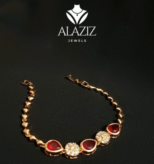This elegant bracelet features a repeating pattern of teardrop-shaped pink stones set in gold, alternating with circular clusters of sparkling white stones. The combination of warm gold tones, Red hues, and brilliant white accents creates a luxurious and eye-catching design, perfect for formal occasions or adding a touch of sophistication to everyday wear.