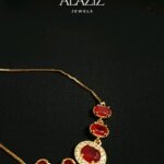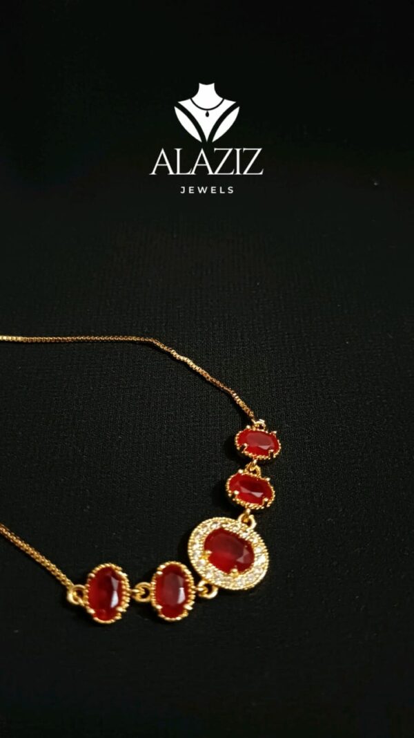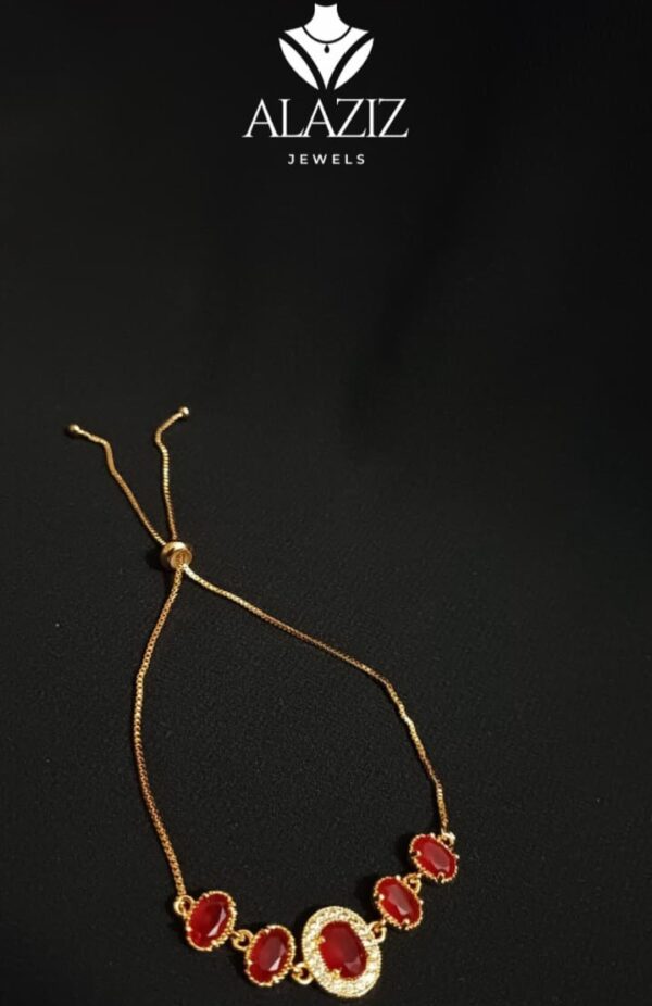 Specifications:A gold-toned bracelet adorned with three red gemstone charms in circular frames, offering a bold and festive look.