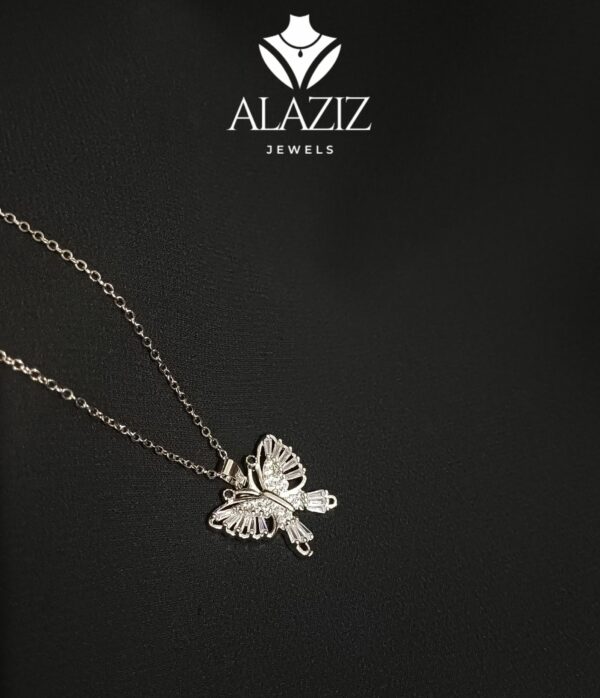 This elegant silver necklace features a finely crafted butterfly pendant with intricate wing detailing and a small gemstone accent near the top. Suspended from a delicate chain, the design captures a sense of grace and charm, making it a perfect accessory for both casual and formal occasions.