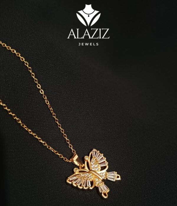 This elegant golden necklace features a finely crafted butterfly pendant with intricate wing detailing and a small gemstone accent near the top. Suspended from a delicate chain, the design captures a sense of grace and charm, making it a perfect accessory for both casual and formal occasions.