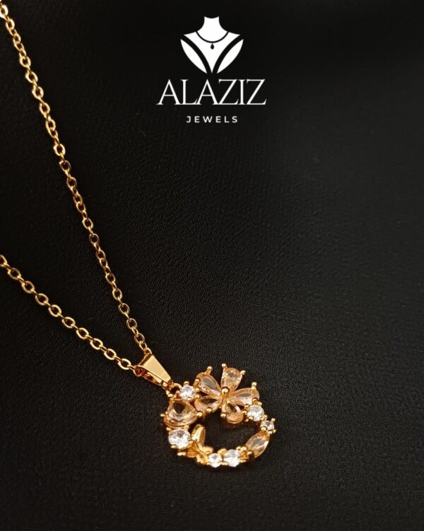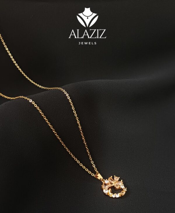 This delicate gold necklace features a circular pendant adorned with clear gemstones arranged in a floral or wreath-like pattern, topped with a charming bow design. Suspended from a fine gold chain, the piece exudes elegance and femininity, making it a perfect accessory for graceful, sophisticated looks.