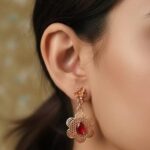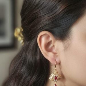 Small parcel items ship regular ground via delivery services such as FedEx, UPS or DHL. Orders typically take 2-3 business days to process and in-stock items will usually be delivered 3-5 days from the date that they ship (depending on origin and destination). If there is a delay, you will be notified by email. No signature is required for standard ground shipping, so you may want to make arrangements to have packages brought inside soon after delivery, if you are unable to receive it in person.This elegant pair of gold earrings features a floral motif with a central red gemstone, surrounded by delicate petal-like filigree work. A small gold flower connects the hook to the main design, adding a graceful touch. The rich contrast of gold and red enhances their luxurious appeal, making them perfect for festive or traditional occasions.