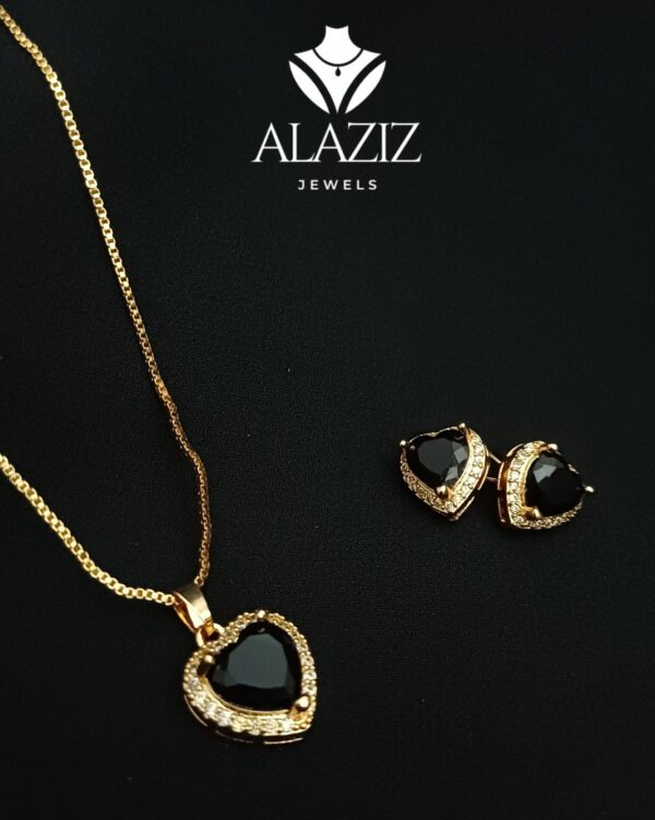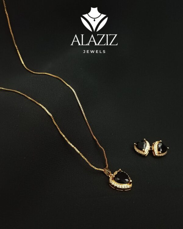 This elegant jewelry set includes a golden necklace and matching earrings, each featuring a teardrop-shaped black gemstone surrounded by sparkling clear stones. The coordinated design exudes sophistication and charm, making it a perfect choice for formal occasions or as a thoughtful gift.