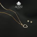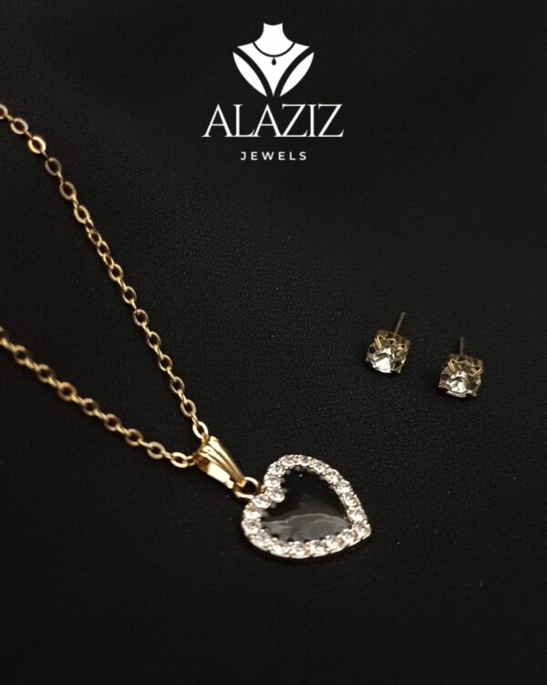 This graceful golden set includes a heart-shaped pendant necklace encrusted with sparkling clear stones, paired with matching stud earrings featuring single clear stones. The elegant and coordinated design makes it a timeless choice for gifting or adding a touch of sparkle to any outfit.