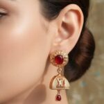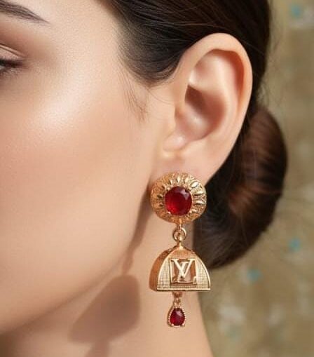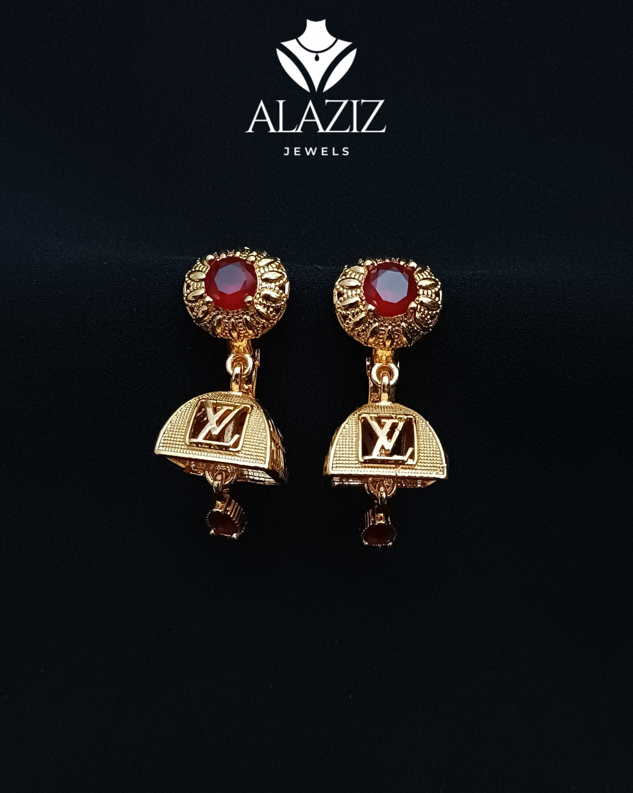 These gold-toned jhumka-style earrings feature a luxurious design with a red circular gemstone set in a textured gold base at the top. Hanging below is a charm shaped like a handbag, embellished with the iconic “LV” logo, blending traditional jewelry aesthetics with high-fashion branding. The rich colors and intricate detailing make them a striking accessory for both festive and upscale occasions.