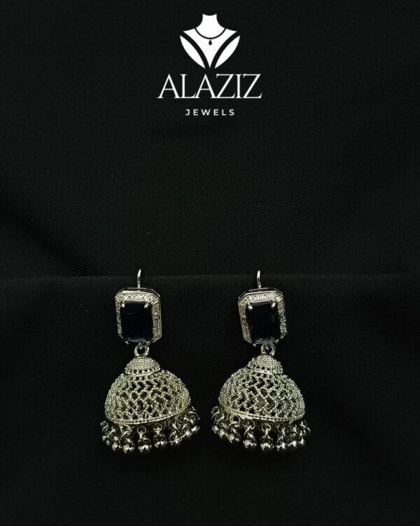 This pair of traditional jhumka earrings features a square-shaped stud with intricate detailing, leading to a dome-shaped drop adorned with delicate filigree work. The bottom edge is embellished with tiny dangling beads, adding movement and charm. Finished in a rich silver tone, these earrings reflect classic South Asian craftsmanship and are perfect for festive occasions or cultural celebrations.
