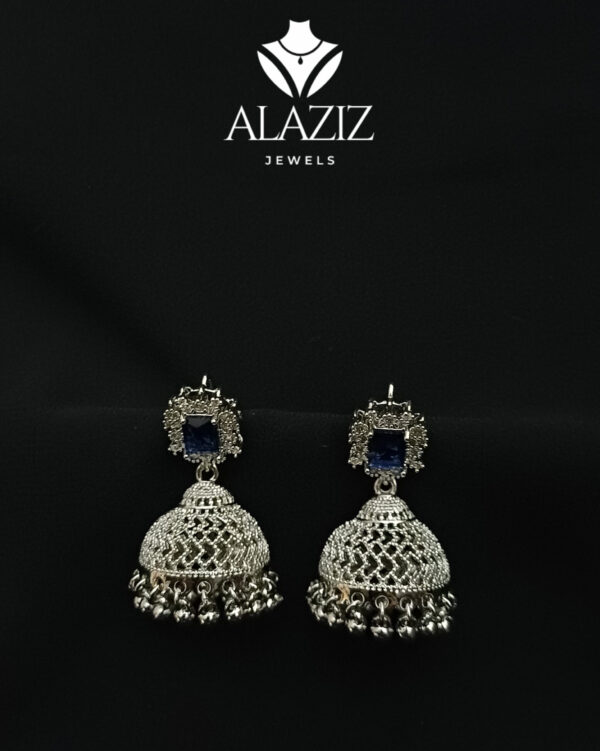 This pair of traditional jhumka earrings features a square-shaped stud with intricate detailing, leading to a dome-shaped drop adorned with delicate filigree work. The bottom edge is embellished with tiny dangling beads, adding movement and charm. Finished in a rich silver tone, these earrings reflect classic South Asian craftsmanship and are perfect for festive occasions or cultural celebrations.