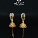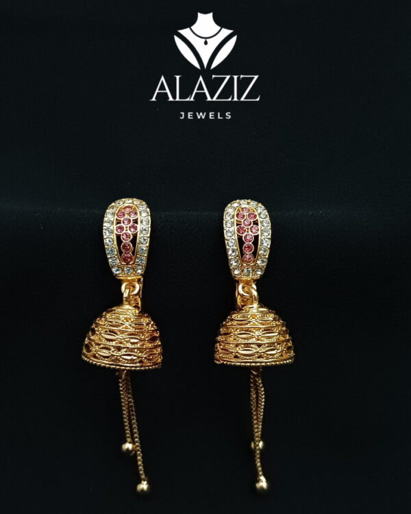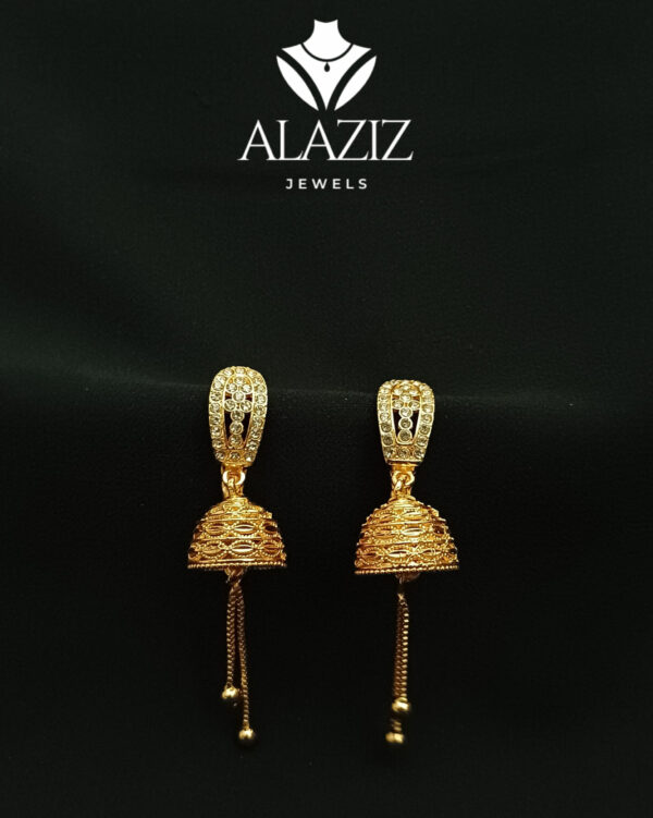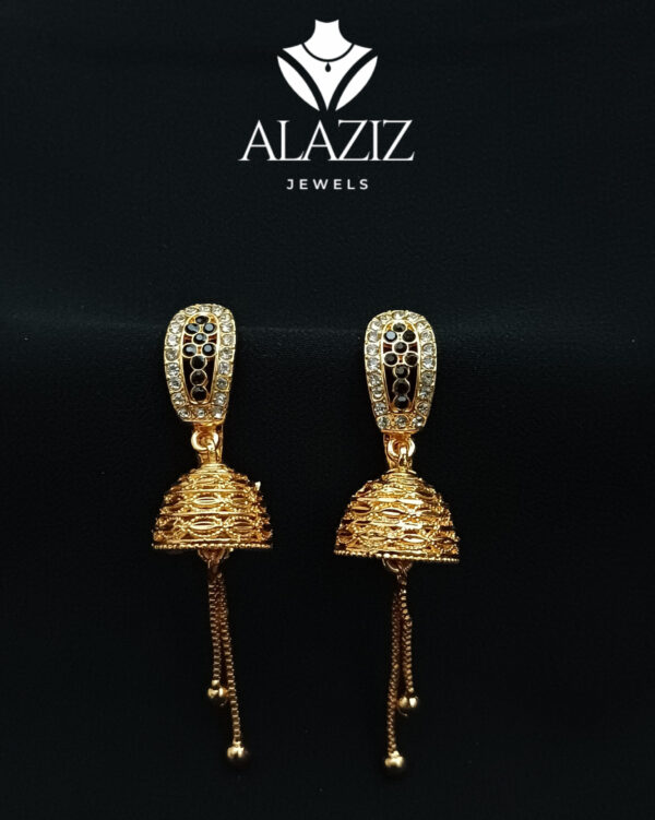 This elegant pair of gold-colored jhumka earrings features a dome-shaped design with intricate detailing and a studded top. Two delicate chains hang from each dome, ending in small spherical beads that add graceful movement. Their traditional Indian style makes them a perfect match for festive attire, highlighting refined craftsmanship and cultural charm.
