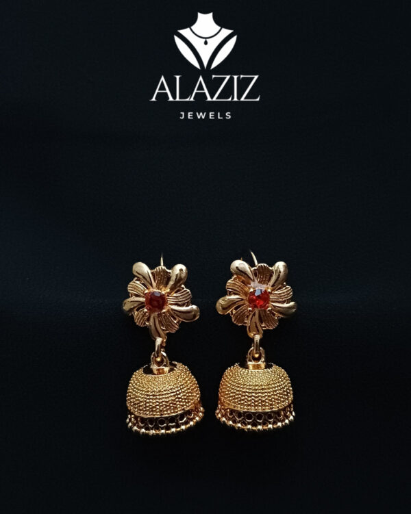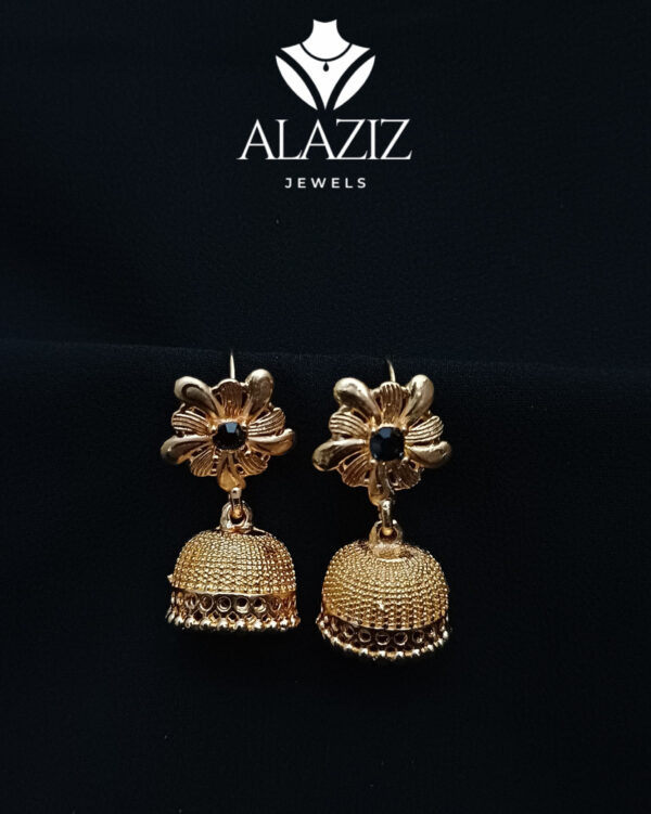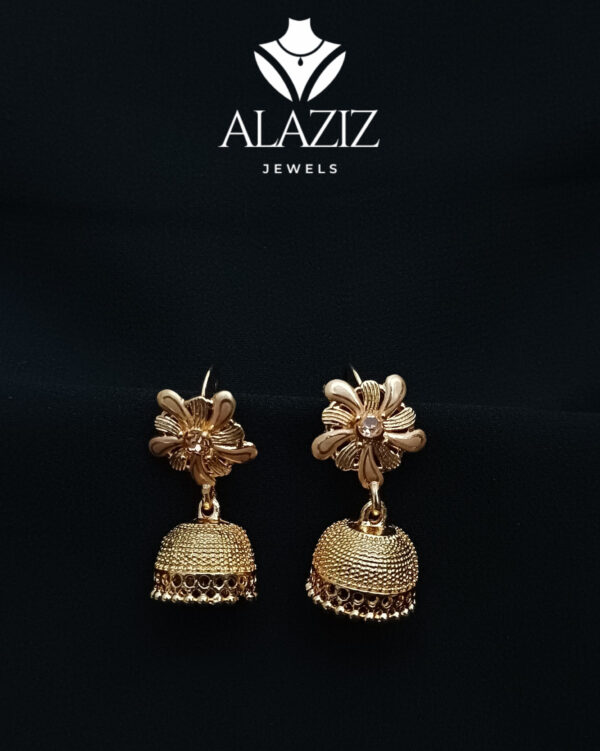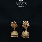 This pair of gold-toned jhumka earrings showcases exquisite traditional craftsmanship. Each earring features a floral motif at the top with finely detailed petals and a central bead, leading to a dome-shaped drop with a textured surface. The bottom fringe adds a graceful touch, enhancing the ornate and elegant design. Perfect for festive occasions, these earrings beautifully reflect the richness of South Asian jewelry heritage.