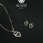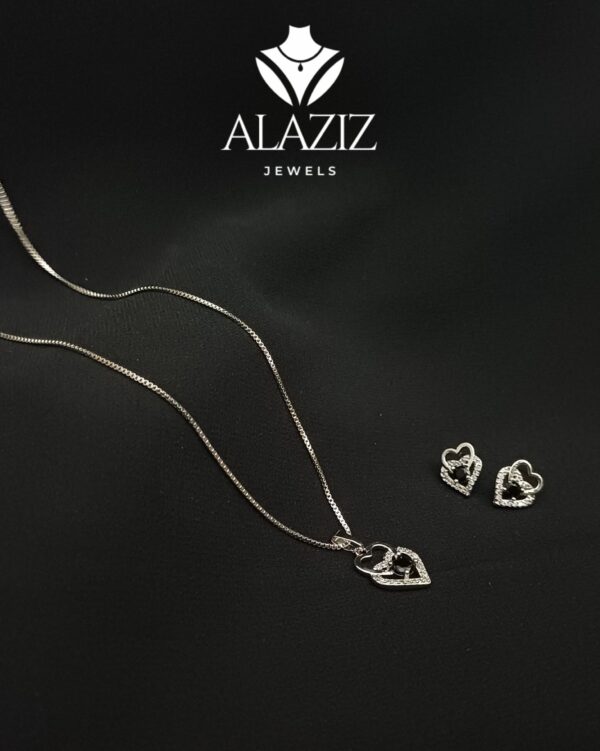 This romantic gold jewelry set features a necklace and matching earrings, each adorned with two interlocking hearts—one embellished with sparkling stones for added elegance. The coordinated design symbolizes love and unity, making it a perfect gift for special occasions or cherished moments.